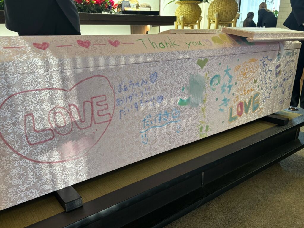 ご参列の皆様一人ひとりがペンや筆を手に取り、たくさんの想い出と感謝の言葉をお棺に綴りました。